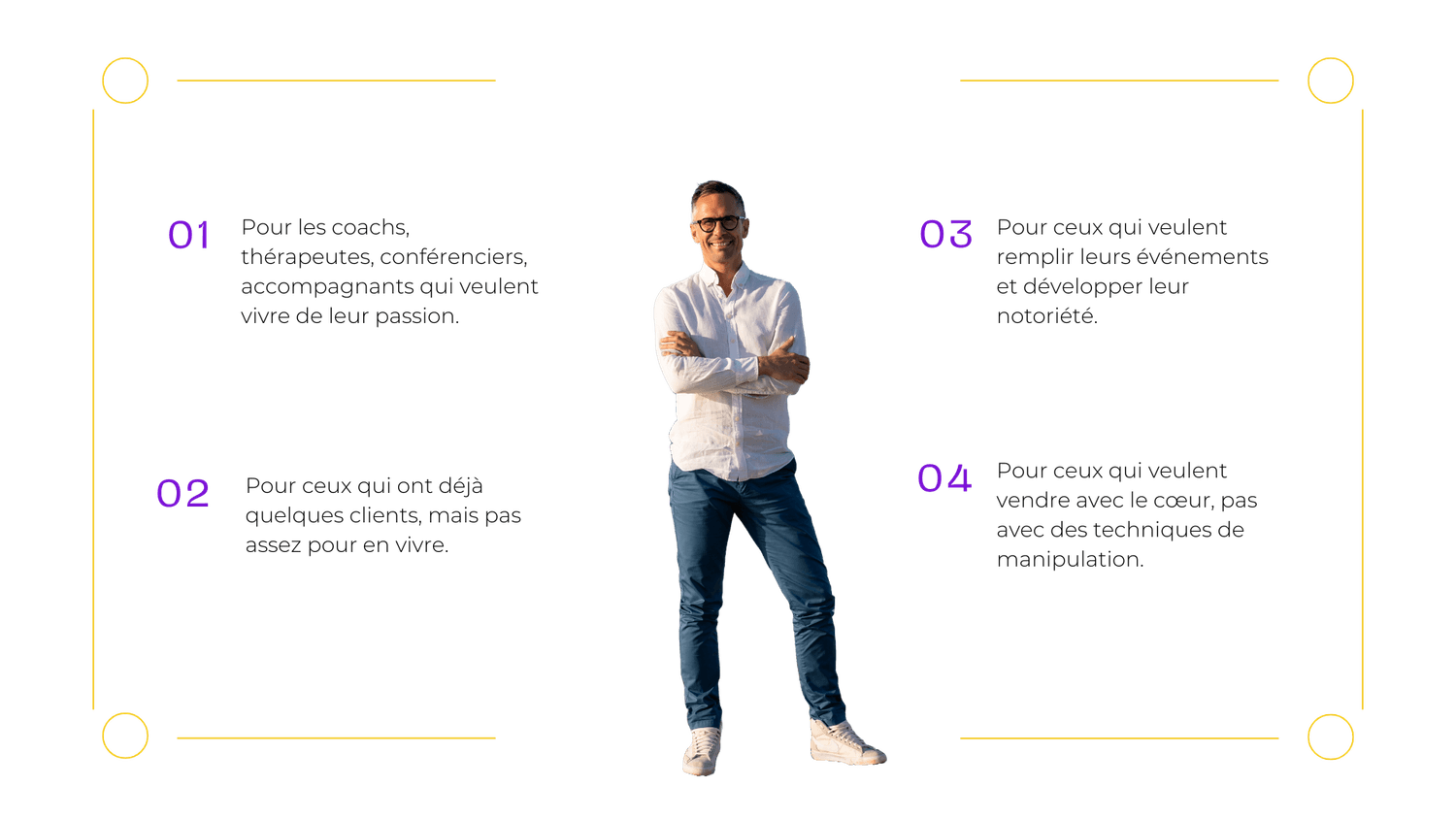 Aujourd’hui, j’accompagne des coachs, conférenciers et thérapeutes qui veulent faire ce même saut. Et c’est exactement ce que je vais t’apprendre dans ce programme pas-à-pas et sur-mesure.